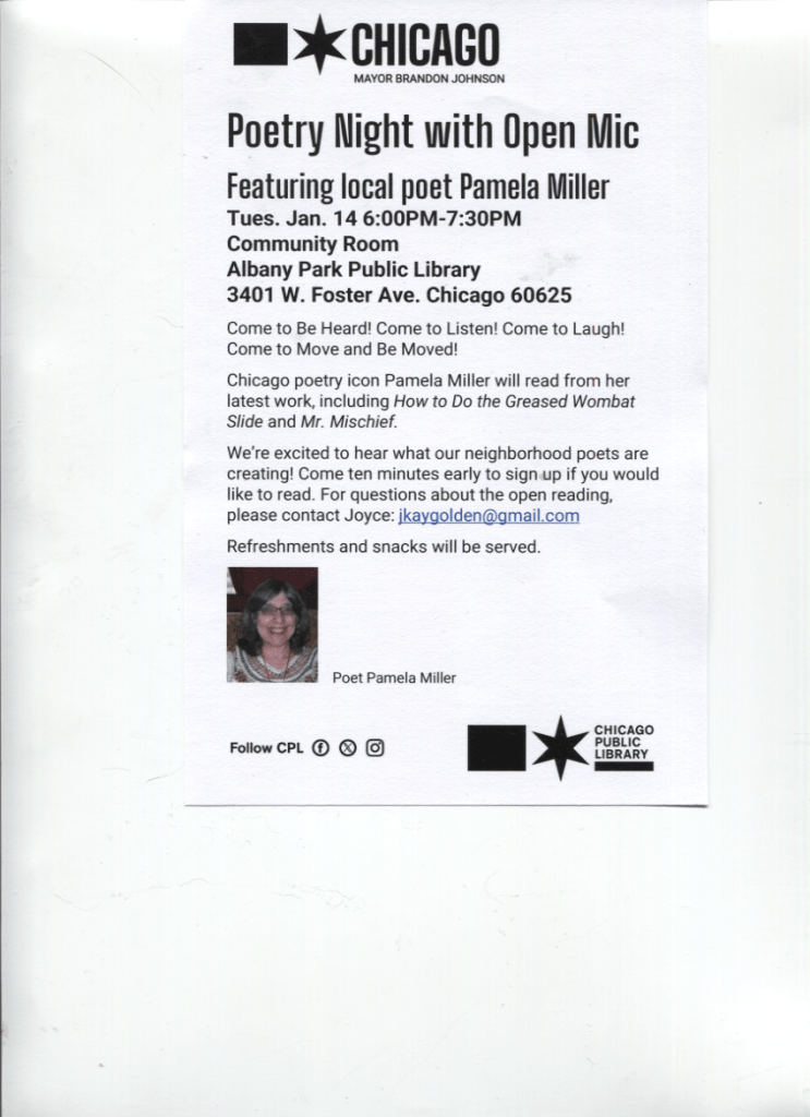 I’m helping to organize literary events at Albany Park Library, and here’s one that’s coming up. You have a chance to participate! Come early if you’d like to sign up.